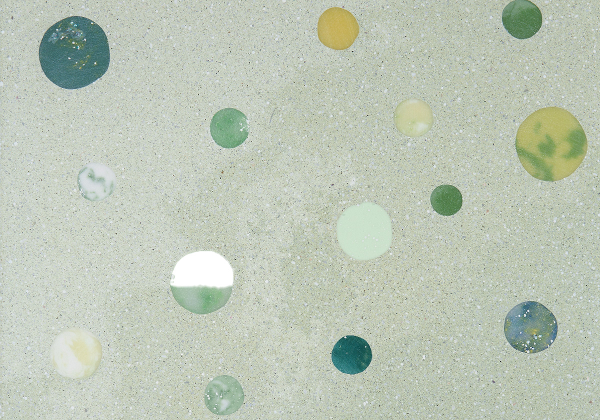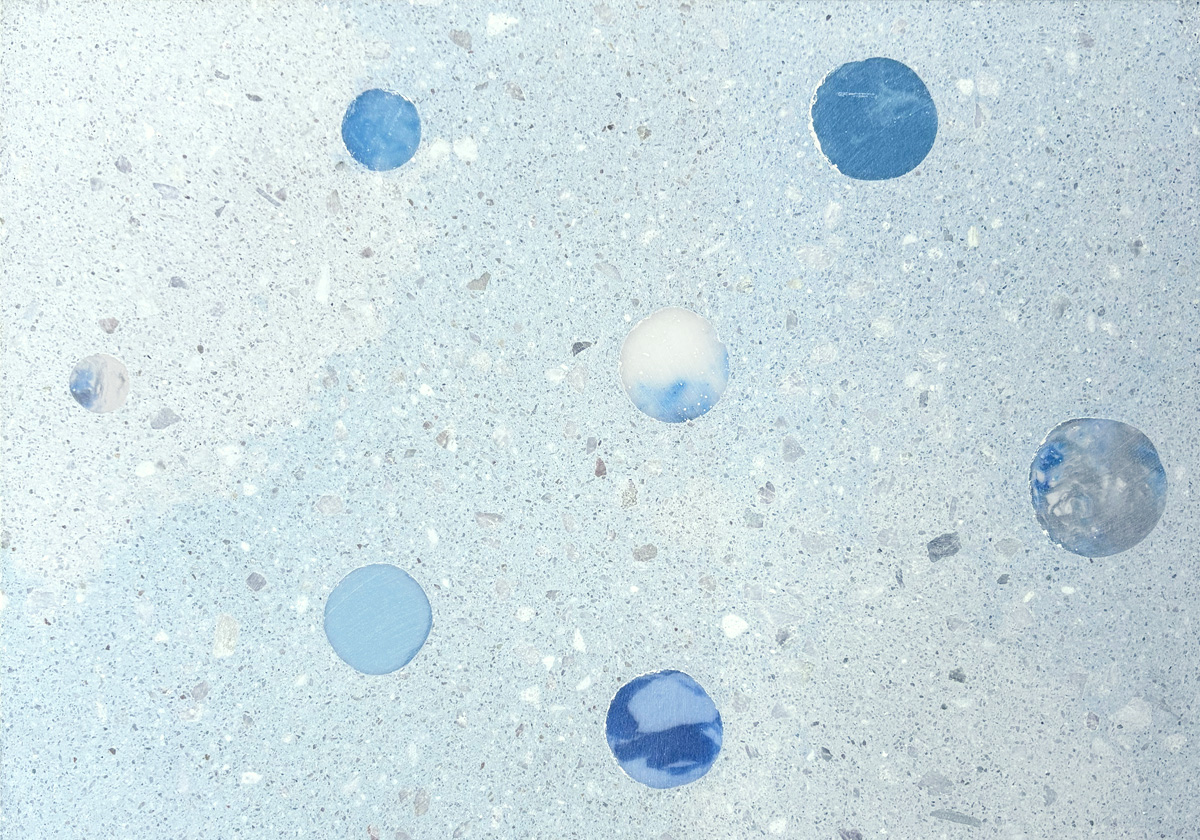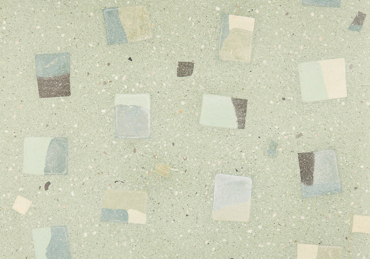 The tops and the products in Opus are made with a mixture of limestone and clay and are hand-decorated with a modern mosaic in recycled glass or ceramic fragments.