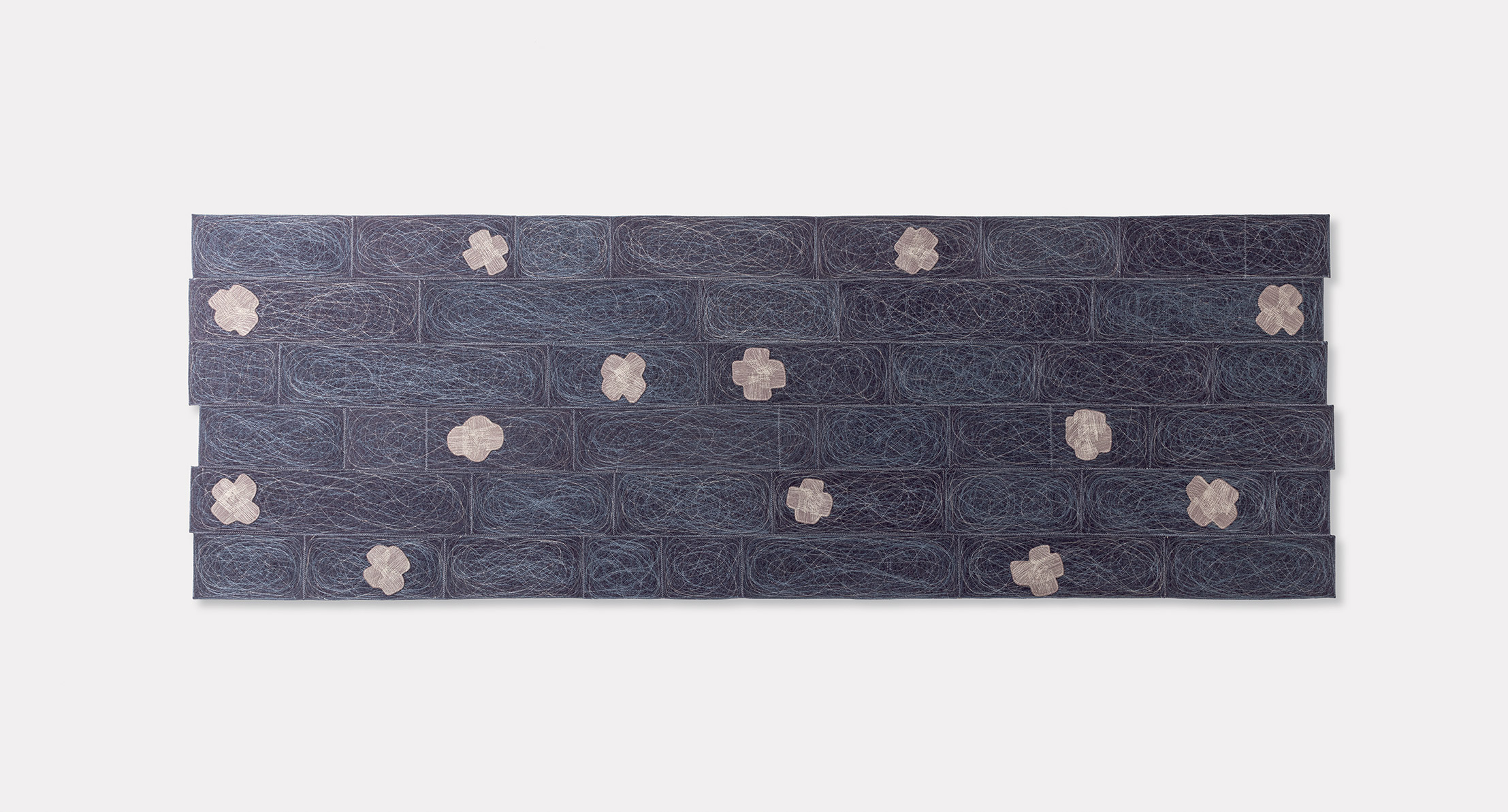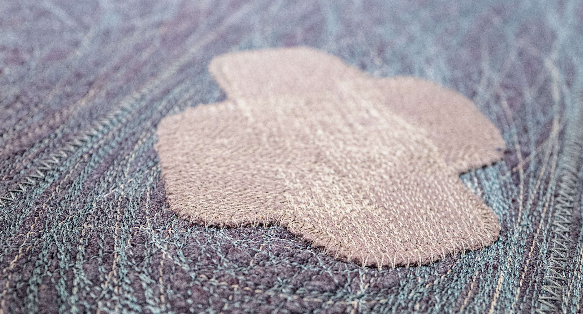 Each element is machine-embroidered with two threads in different colour creating a free-form pattern.