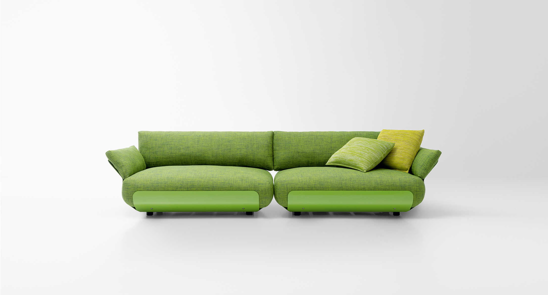 Series composed of armchair, central element, end elements with armrest and pouf.