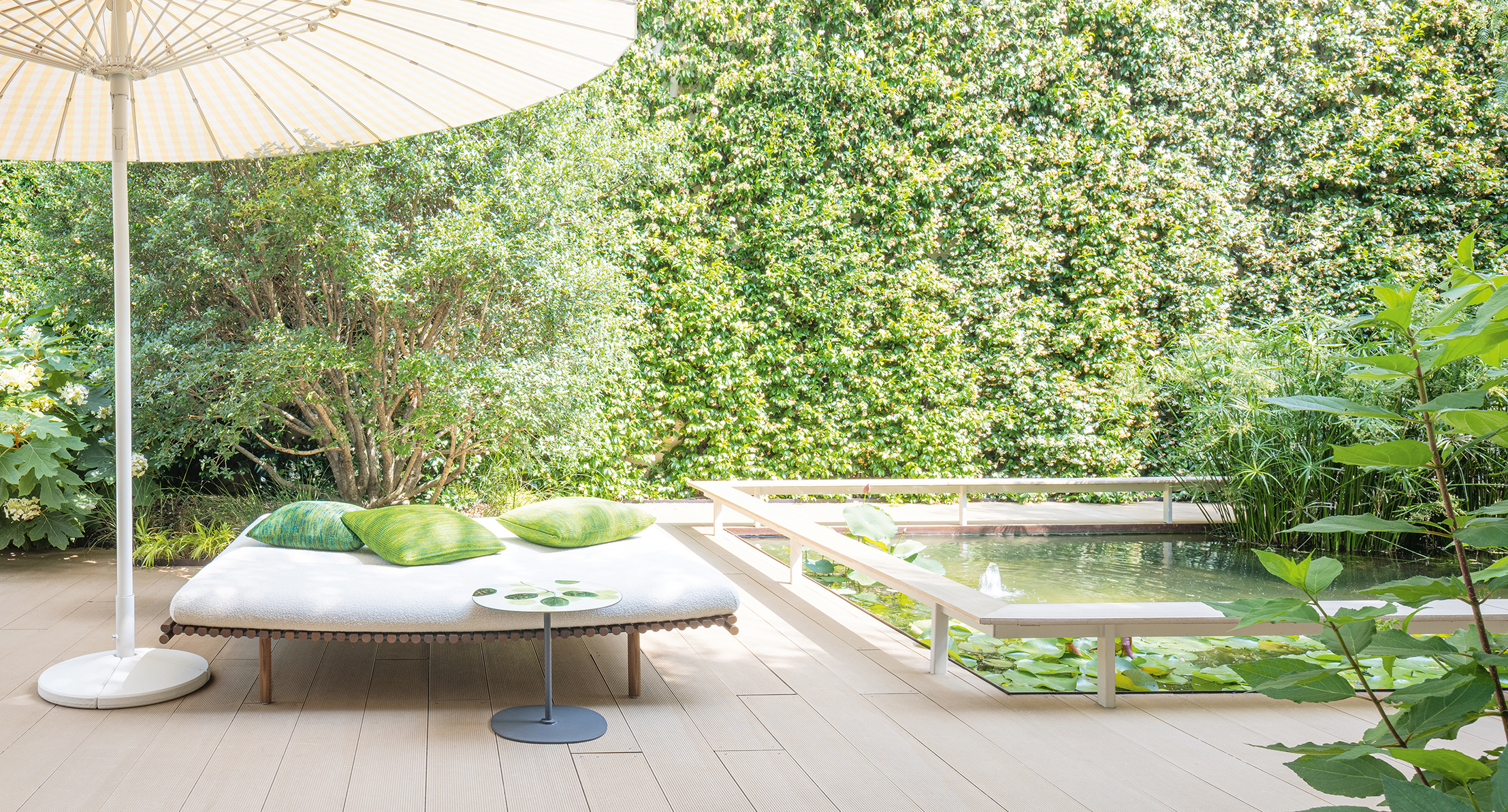 As an alternative to the seat pad upholstered in fabric, it is possible to use one or more Plump, pad made weaving by hand elements in Chain Outdoor mélange tubular knit.