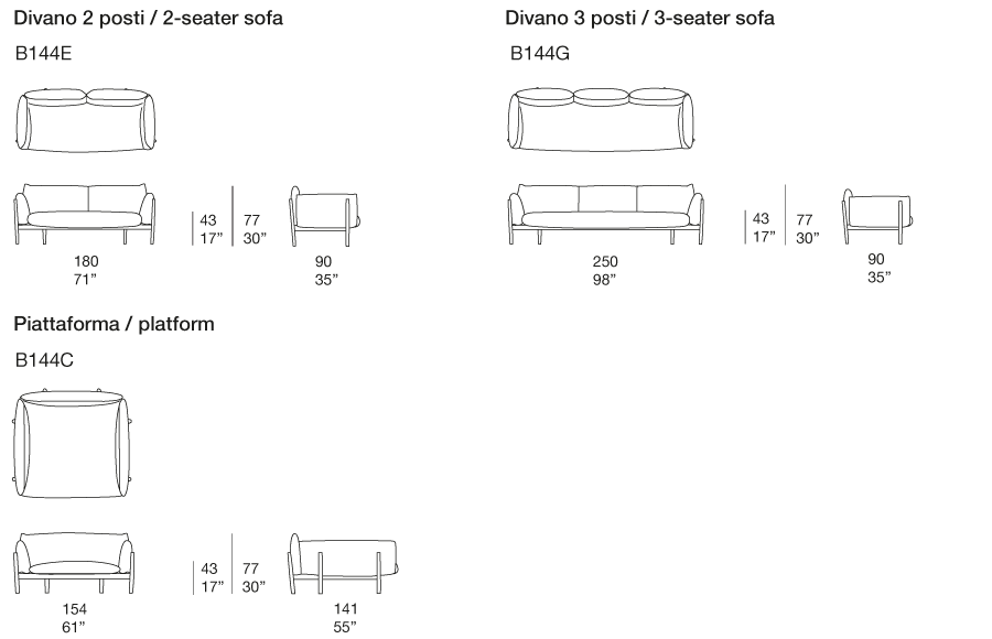 Notes: loose cushions are recommended for complete comfort; quantity and dimensions depend on the selected product.