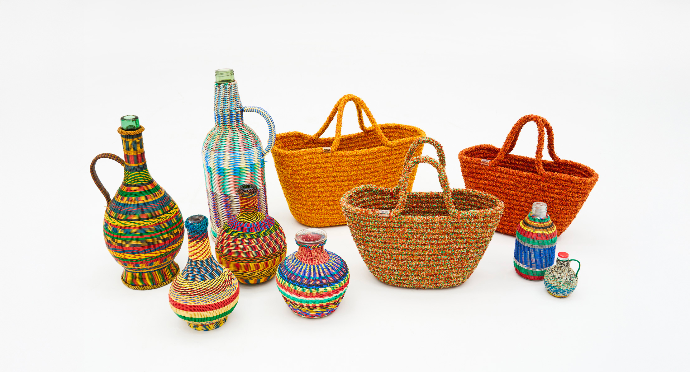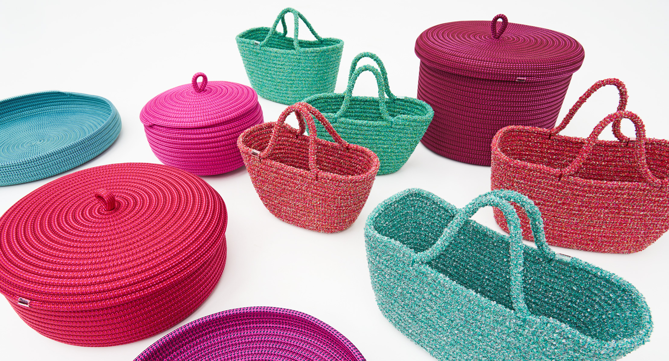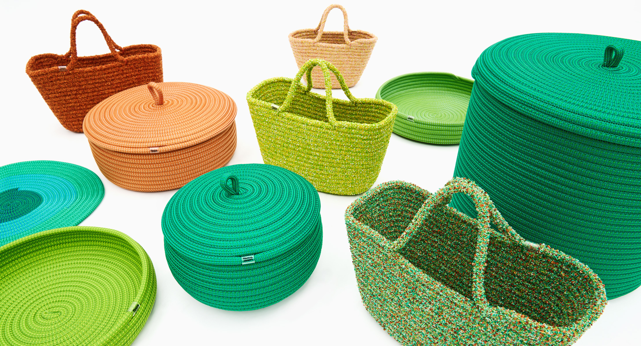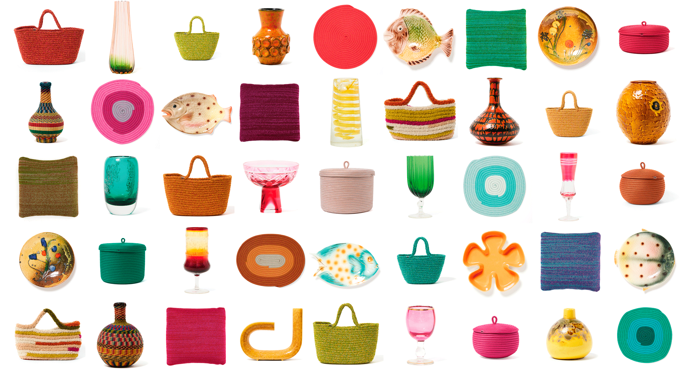 La selezione, curata da Paola Lenti, propone vasi, bicchieri e piatti in vetro e ceramica accanto a sottopiatti, cesti, cuscini e borse nei filati e nei colori che definiscono l’identità del marchio, tutti disponibili all’acquisto.
