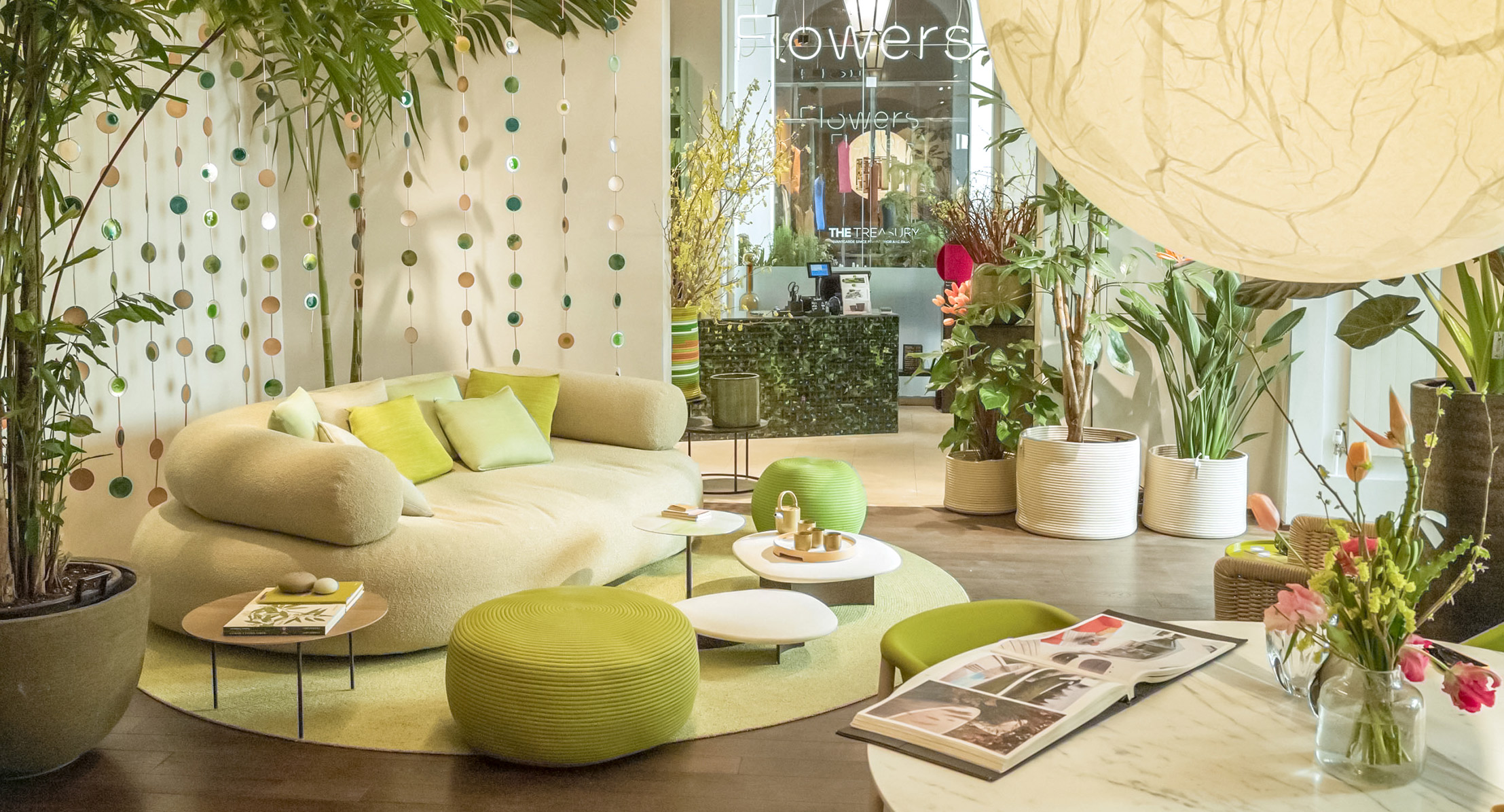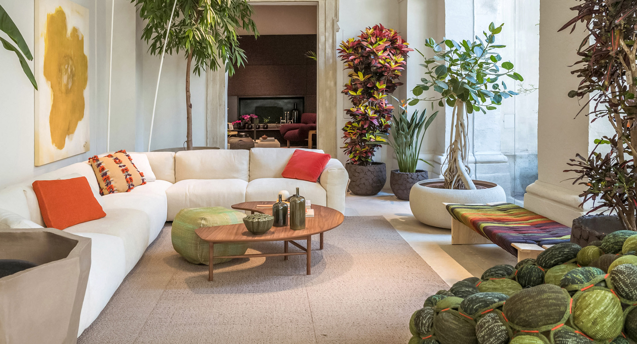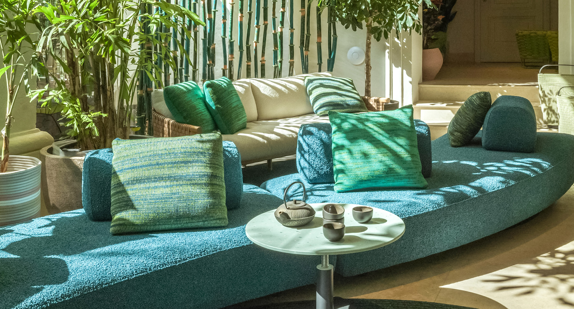Nel cortile del palazzo, il paesaggio si rivela poco alla volta come un insieme armonioso di composizioni living, attraversate da un verde intenso declinato nelle sue molteplici sfumature, espressione del patrimonio stratificato di colori, tessuti e superfici che si traduce nel linguaggio Paola Lenti: coerente e sempre riconoscibile. Ogni isola è definita dal colore ed è composta da arredi e complementi i cui tessuti, corde, intrecci e superfici – dalla pietra lavica al cemento, alla ceramica – dialogano per contrasti e affinità.