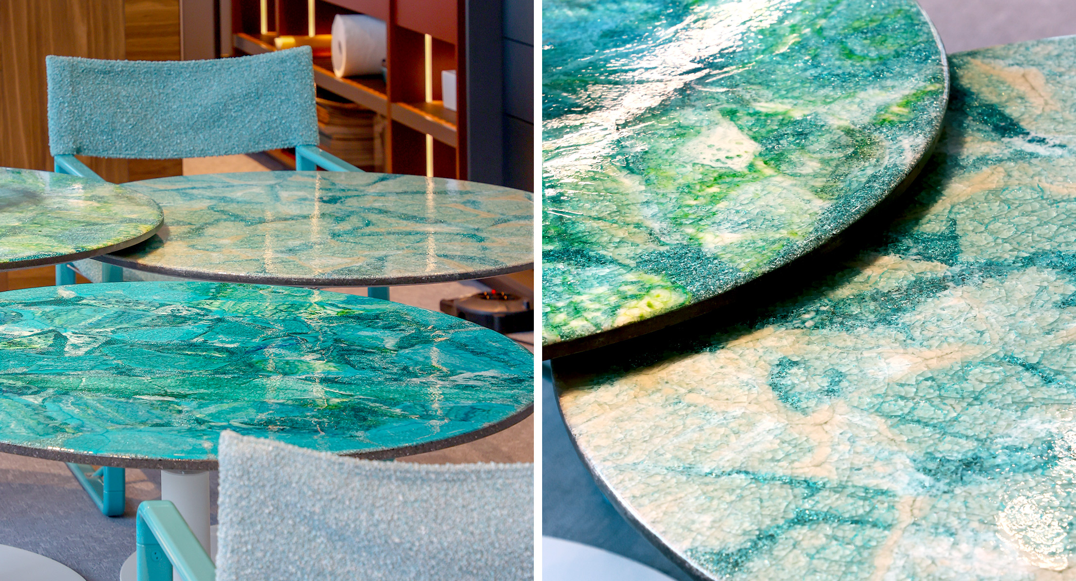 Tra le tante proposte, le sedute Ami nelle sfumature dell’azzurro, completate da cuscini in Maglia Rasata e dal tavolino Anemone, tutto in delicate nuance acquamarina; i tavoli Sciara, nelle tonalità del blu, e le sedie Capri in tessuto Moss, a generare un dialogo armonico tra i colori dei materiali e quelli dei rivestimenti.