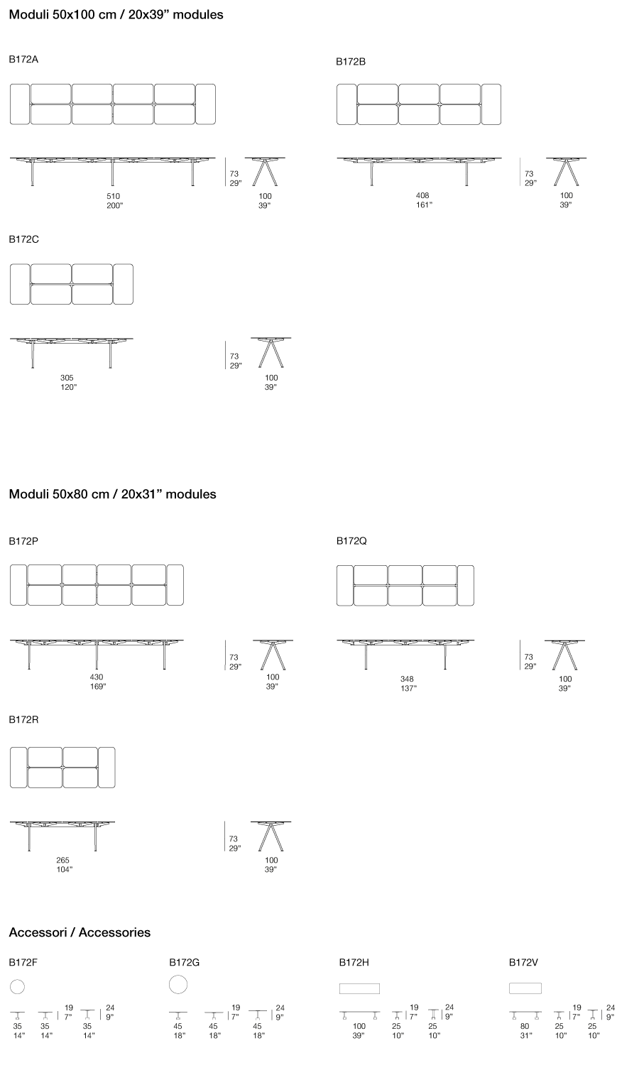 I piani accessori sono disponibili in due altezze (cm. 19 e cm. 24) e scorrono lungo la barra centrale che collega le basi del tavolo per poter essere fissati nella posizione desiderata. I piani codice B172F e B172G sono girevoli.