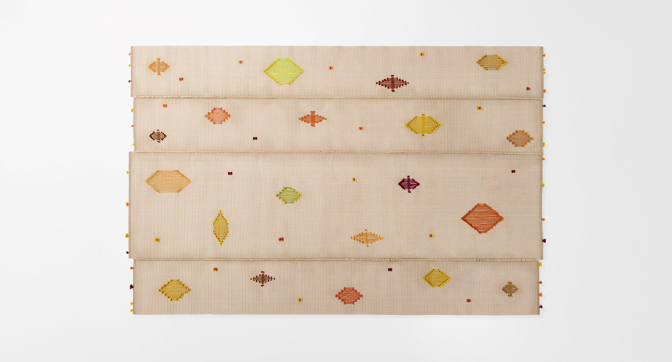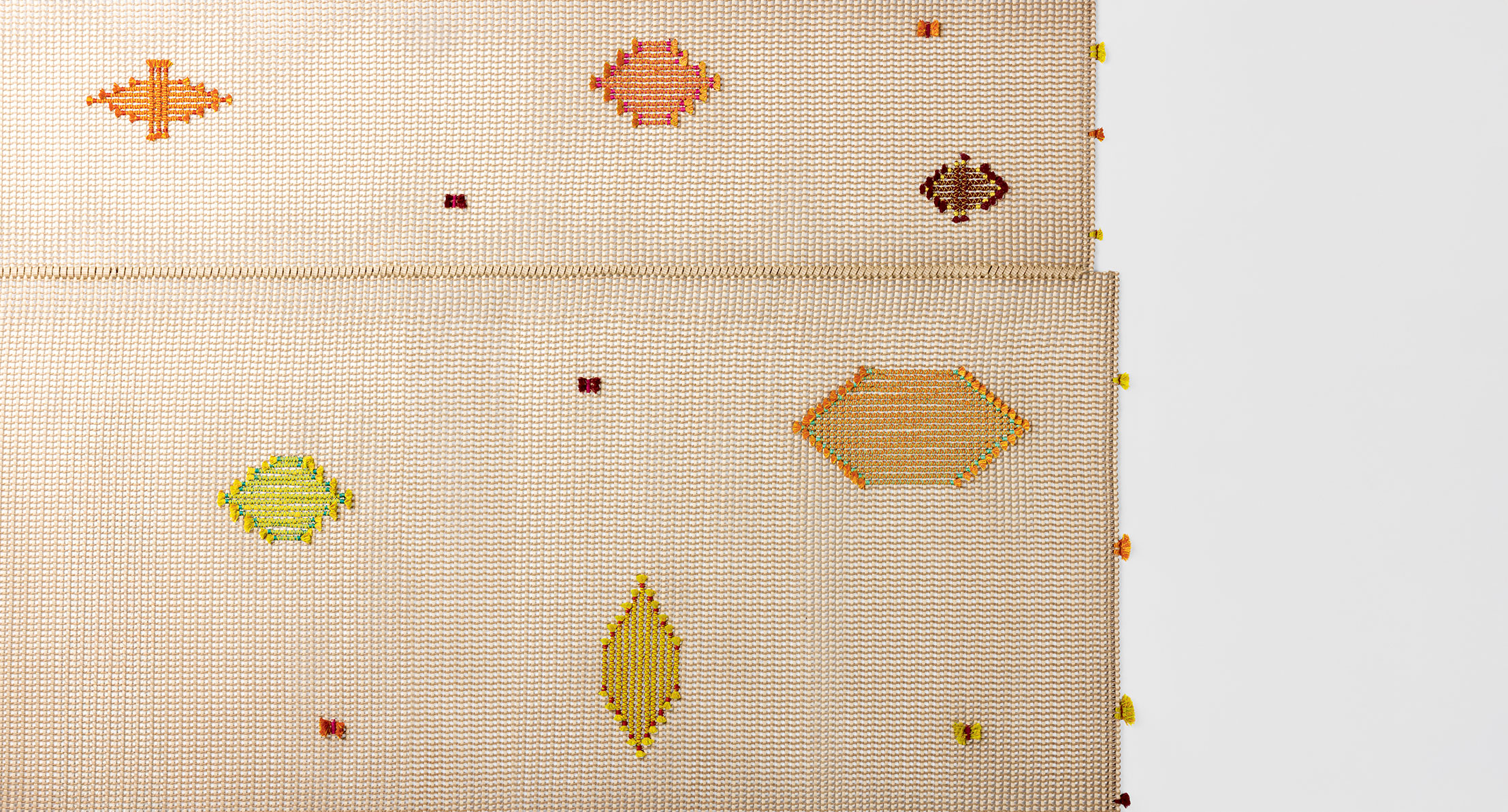 La posizione e il numero dei decori sono studiati volta per volta espressamente per ogni singolo tappeto, per ottenere dai colori scelti la migliore resa cromatica ed estetica possibile. Piccole nappe in corda decorano infine il lato corto del tappeto.
