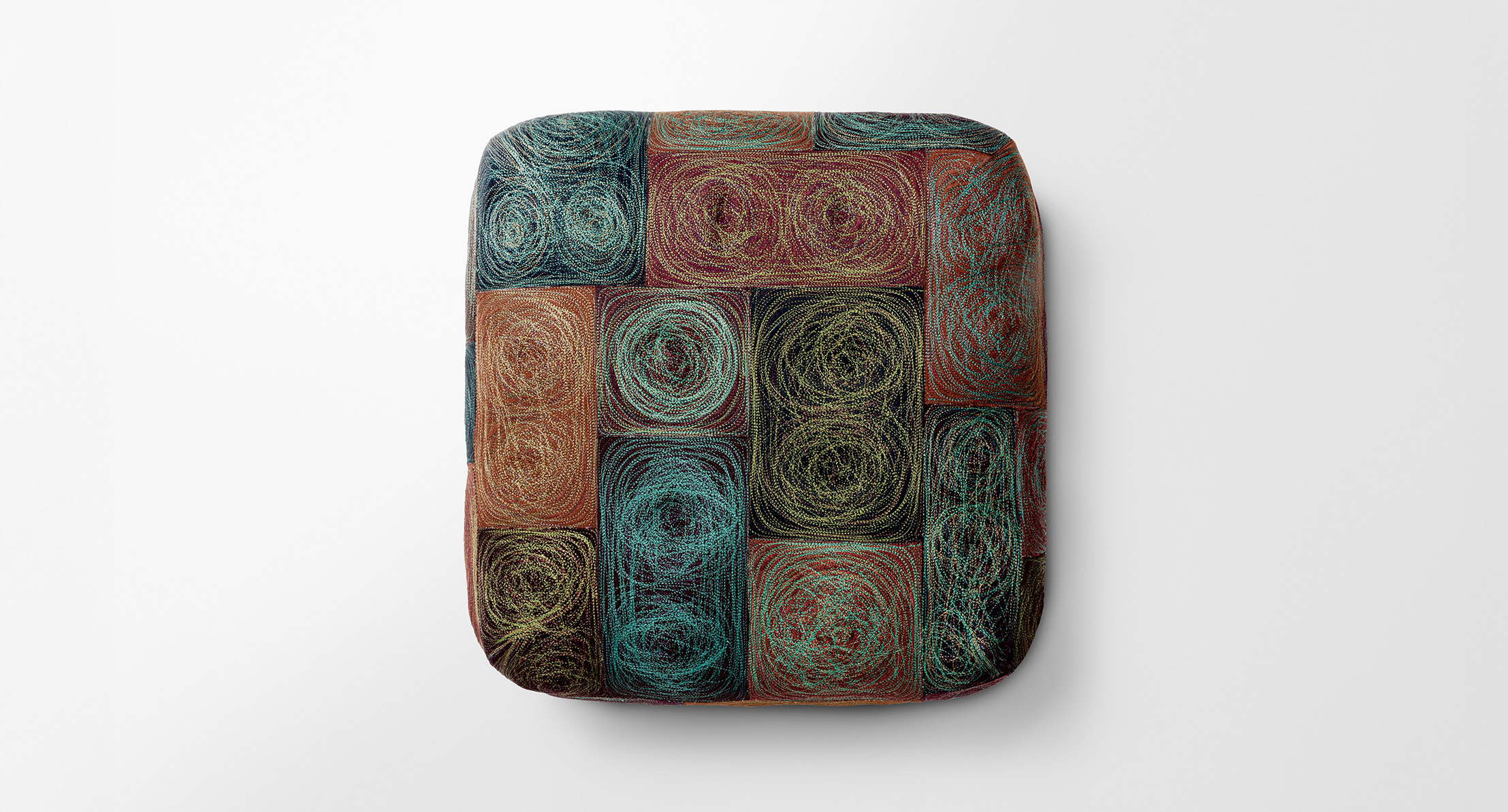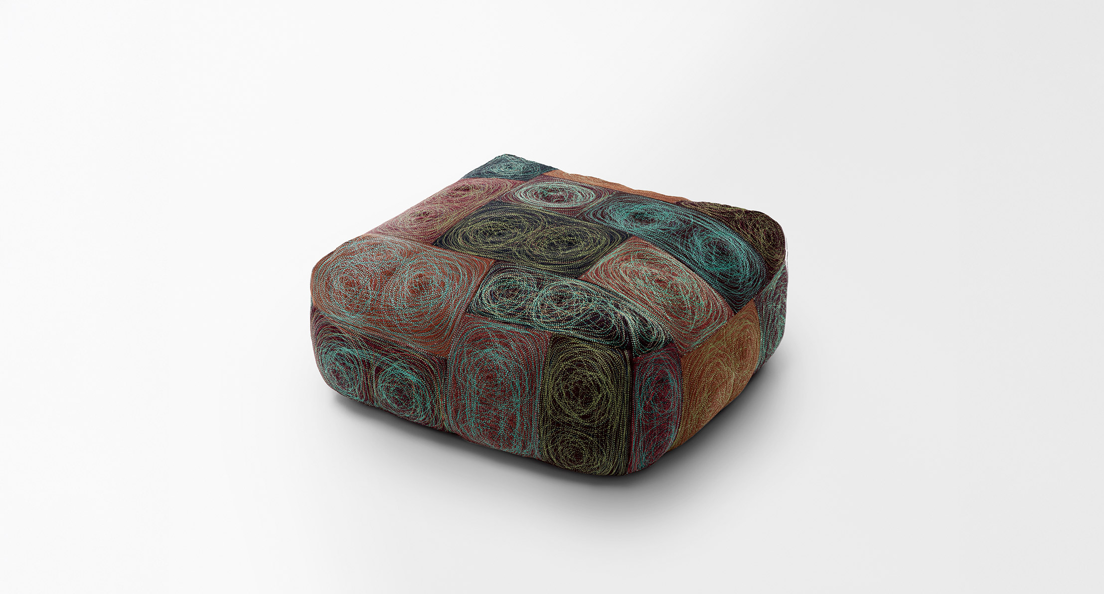 Il rivestimento dei pouf Ghirigoro è decorato con ricami e cuciture a macchina che prevedono l’uso di filati provenienti dalla lavorazione dei tessuti per esterno di collezione e che variano di volta in volta secondo i movimenti imposti alla macchina stessa dall’operatore.