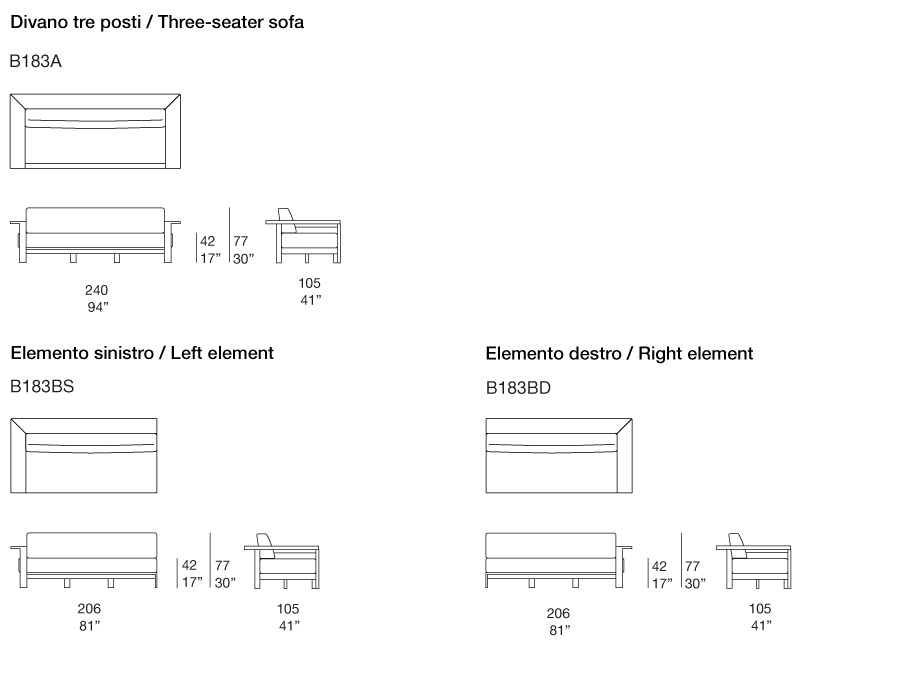 Divano tre posti ed elementi modulari componibili con bracciolo destro o sinistro.