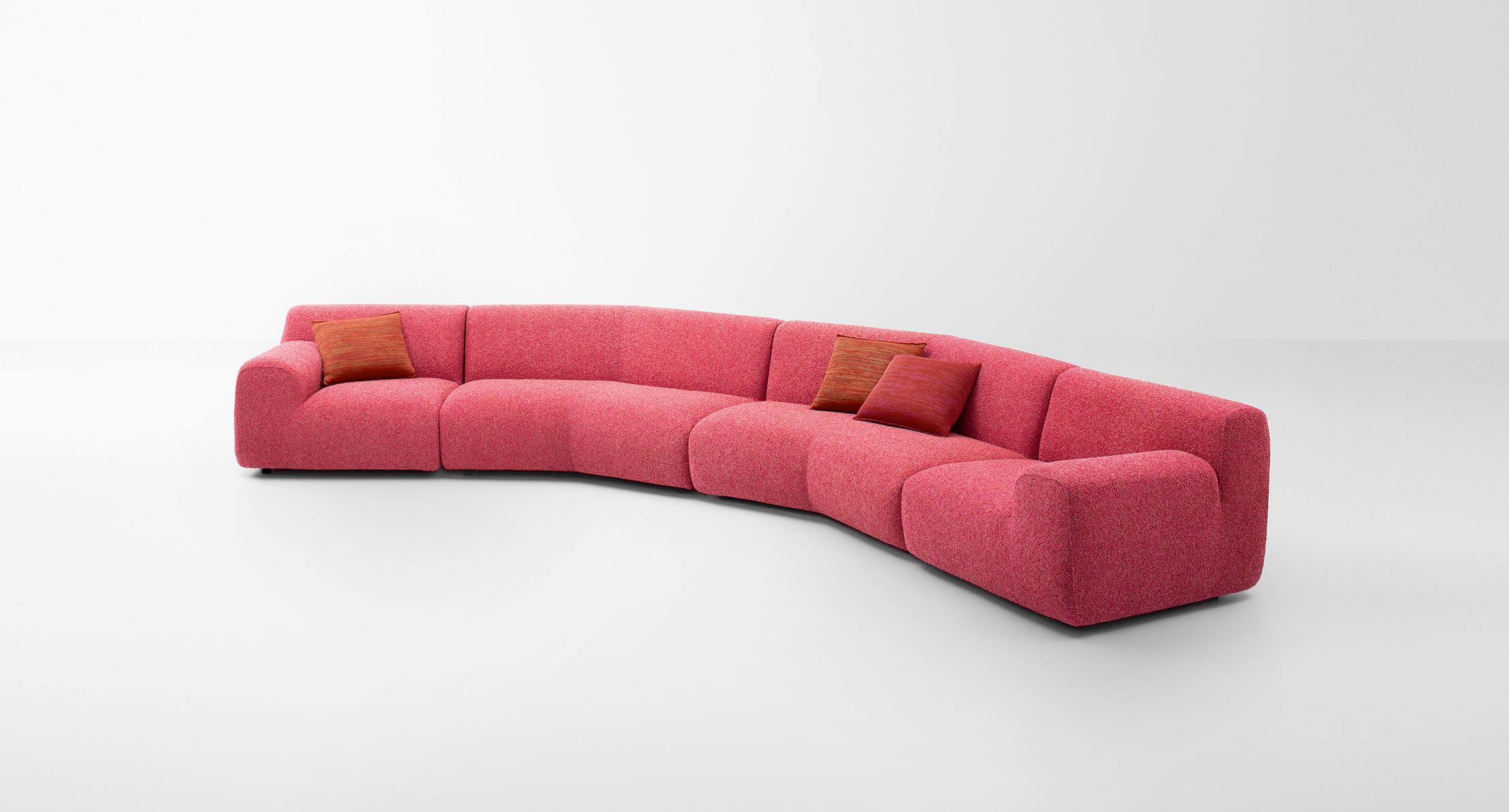Sistema di sedute modulari composto da elementi con bracciolo, elemento centrale e angolare, chaise longue e pouf.